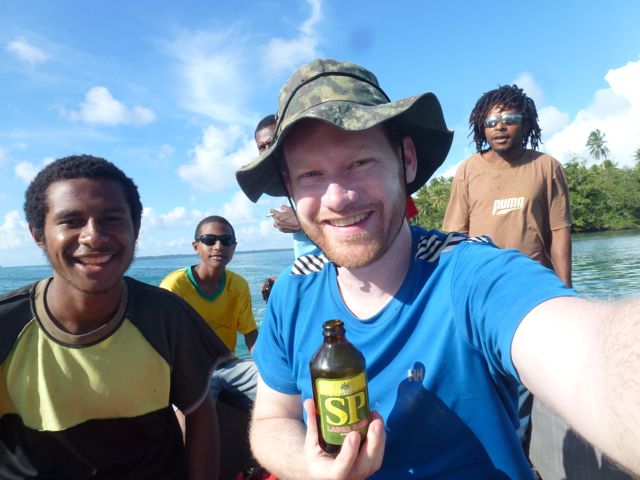 The next day, a Sunday, some local kids took me out for a walk and showed me around. They took me to their school and we walked back along beach where we saw WWII wreckage from the war with the Japanese. It was amazing how much rusting war junk was still lying around. Back at the guesthouse, one of the young guys said his older brother wanted to meet me. He was downstairs drinking South Pacific, PNG’s only local beer with a few friends. He was a very lively and friendly chap and they enjoyed the novelty of having a lost white guy there. He arranged for a friend to take us all out on their motorboat, loaded up with South Pacific, to a little island off-shore where we swam in gorgeous warm water. Then they took me on a little tour to a huge channel bombed out of the island by the Japanese for their submarines with wreckage of pontoons by the shore. Everyone was getting drunk. I’d tried to stay off the beer but had given in under pressure by this point and was quite merry myself. We stopped at a little store to buy gas but there was none available and we didn’t have enough to get home. Fortunately my friends managed to stop another boat who sold us some petrol and we made it back. One of the guys was so drunk he was lying semi-unconscious in the boat as the rest of us dragged it up out of the water. After a couple more beers I sloped off to bed. What an awesome day. Expect the unexpected in Papua New Guinea.